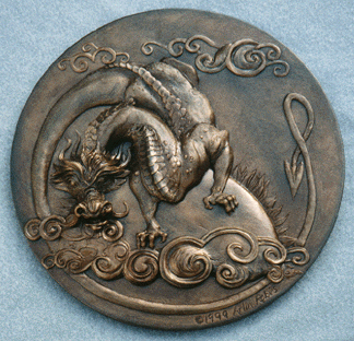 And here's the most recent of my bas relief's. This one really exercises the concept of foreshortening. I got into alot of subtle texture for the body, and enjoyed the head detail. As mythical subjects, dragons are open to a myriad of visual forms, and have a huge range of emotional content. This one follows a more Asian style, but I've also created European types. |