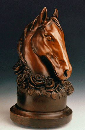 Wreathed in Roses © 1989 by Arlin Robins While the Mermaids and Dolphinswere at the foundry, I was commissioned by the Mirage to create a thoroughbred finial cap for the sport bar railing. The challenge was to design something that would work from a 4-inch diameter post, to avoid any sharp or dangerous protrusions, to incorporate the lush "Mirage" feel of fantasy, and still look like a thoroughbred race horse. The Mirage has 28 of these in polished brass. The piece shown here is cast in bronze. I also offer this design as a resin-cast in bonded bronze. |